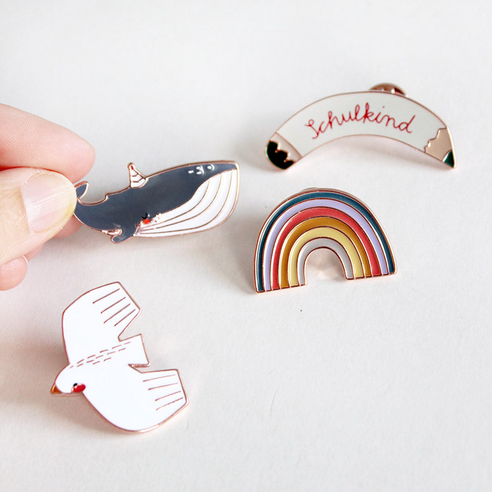 Kleidung mit kleinen Handgriffen schöner machen: Für uns ist keine Tasche zu langweilig und keine Jacke zu einfarbig. Denn mit einem Anstecker ist jedes nullachtfünfzehn Outfit auf einmal individuell und einzigartig. Natürlich klappt das nicht mit jedem Pin-Motiv. Daher überzeugen unsere Produkte mit ihren inneren und äußeren Werten. Mit Stil, Humor und ganz viel Charakter zaubern wir unsere bekannten Tiere und herrlich schrägen Motive, die du vielleicht schon von unseren Aufnähern und Stickern kennst auf neue Formen. Wer möchte schließlich nicht unseren allseits begehrten Regenbogen auf schillerndem Epoxid besitzen? Auch unsere beliebte Friedenstaube und unser Party Wal warten darauf, deine Stoffe zu verschönern. Und das Beste? Die Pins können nach Lust und Laune umgesetzt werden und immer wieder von neuem Farbe auf Kleidung und Co. bringen. Wie Schmuck quasi, nur ohne störend direkt am Körper zu hängen. Vor allem für Kinder, die ein wenig schimmern möchten, perfekt!