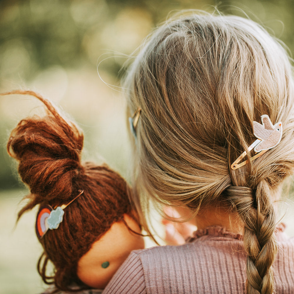 Einfarbige und motivfreie Spangen aus Metall erfüllen zwar ihren Zweck, sind für Kinder aber dennoch sinnlos. Denn wie kann eine Haarspange die Haare schmücken, wenn sie nicht wenigstens ein bisschen aufregend ist? Hier kommen unsere beliebten Charaktere ins Spiel. Mit unverkennbarem Style, viel Charakter und einer Prise Humor überzeugen unsere Haarspangen selbst wählerische Kinder. Ob Löwe, Wal oder unser Crowdpleaser Dackel Detlef: Der Großteil unserer Motive ist im Kopf unserer halfbird Gründerin Mona entstanden, wurde per Hand illustriert und schmückt neben unseren Bügelbildern, Stickern und Postkarten jetzt auch die neuen halfbird-Haarspangen. Dementsprechend kann der Haarschmuck kreativ mit anderen Produkten kombiniert werden. Ein Kindertattoo auf die Hand, ein Bügelbild aufs Shirt und die Haarspangen ins Haar und schon ist das Outfit für Einschulung und Co. komplett. Auch als kleines Präsent zum Verschenken sind die Haarspangen eine gute Idee.