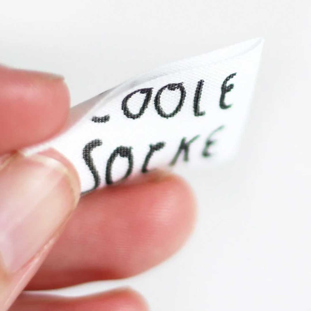 Unsere Stoffetiketten sind aus bedruckter Biobaumwolle oder recyceltem Polyester aus PET-Flaschen.